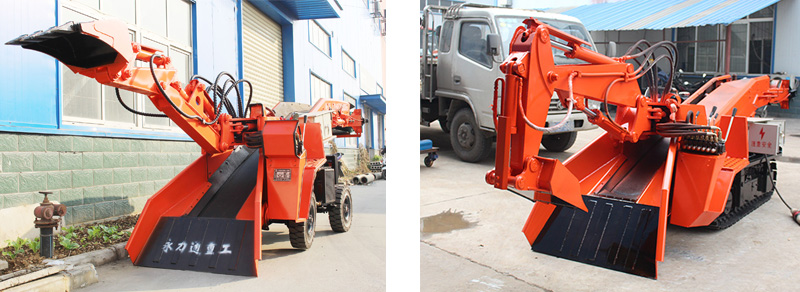 小型扒渣機采用挖機底盤原理設計制造,采用實心輪胎,雙行走馬達,雙油泵輸出,轉彎半徑更小,可實現360度原地旋轉,扒渣機為四輪驅動,推動力大、扒取范圍廣、全斷面裝巖、不需要人工輔助清理工作面;采用模塊式生產,方便下井安裝作業,車身小、結構緊湊、重心低、機動靈活、工作穩定是狹窄面不可替代的機型。
